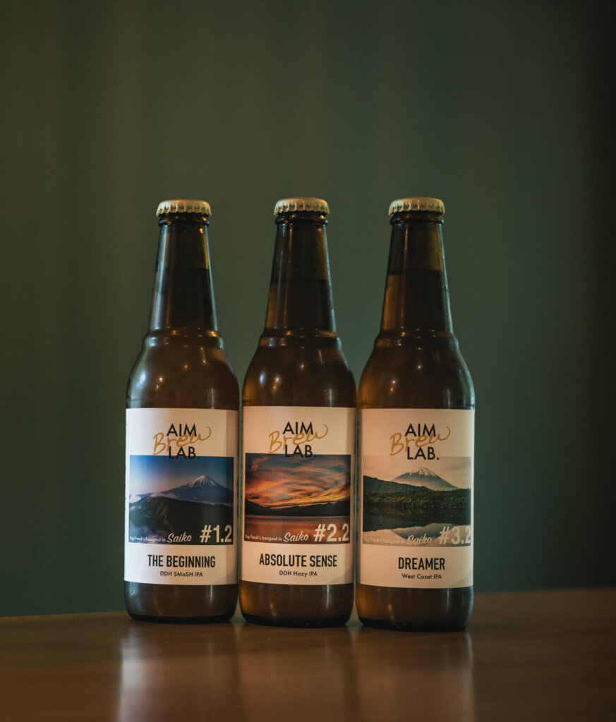 AIM Brew LAB.は、山梨県・富士河口湖町 西湖にて2024年6月より醸造を開始したマイクロブルワリーです。自然と観光が交差する場所で、飲食店様・酒販店様にとって「説明しやすく、選ばれやすい」クラフトビールを造っています。直営タップルームおよびポップアップ販売では前年比200%以上の売上成長を記録し、観光客・インバウンドのお客様からも高い評価をいただいています。