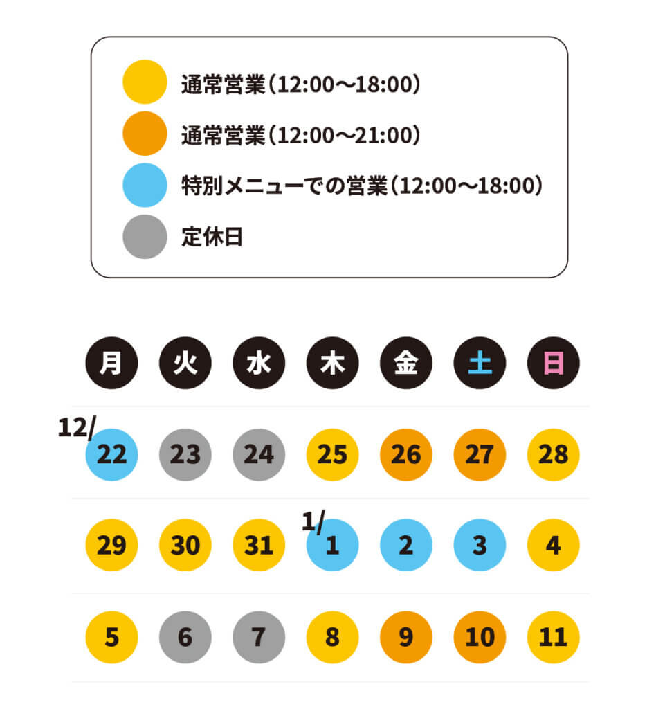 - 12/30(月)・12/31(火)・1/1(水)・1/2(木)・1/3(金)も営業