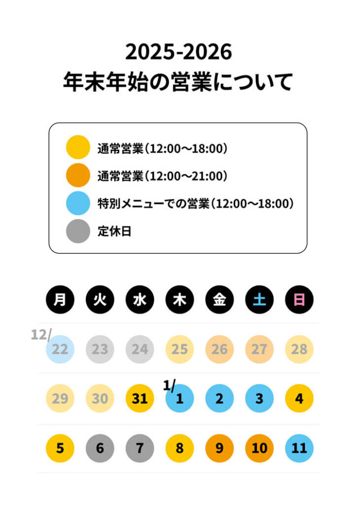 • 一部日程は 特別メニュー(ドリンク中心)での営業 となります